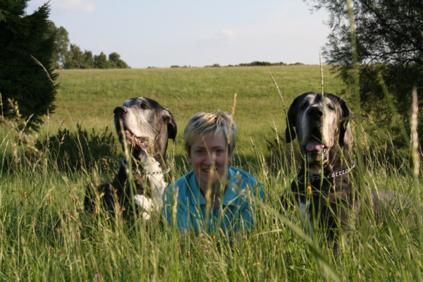 Ich schaute einmal zu, wie ein kleines Doggenmädchen sich in einen Pappkarton setzte und diesen gegen seine Brüder verteidigte. Diese Hündin, Lava vom Vogtlandeck, ist meine treueste Gefährtin geworden und hat meine Liebe zu den Deutschen Doggen geweckt.