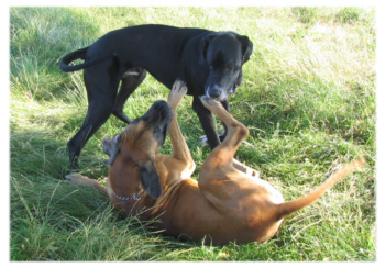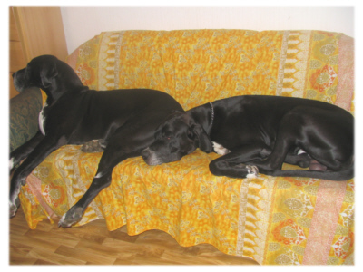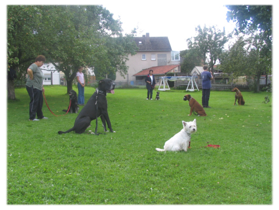 Quattro und ich besuchten heute wieder einmal die Hundeschule Waldhessen. Da ich Quattro vor der Übungsstunde immer noch ein bißchen spielen lassen möchte und auch einige der anderen Teilnehmer aus diesem Grund immer etwas zeitiger kommen, waren wir schon eine dreiviertel Stunde vor Übungsbeginn dort. Auf der Spielwiese spielten gerade einige Welpen und Junghunde im Hundekindergarten. Da Quattro die Welpenspielstunde von klein auf kennt und unsere Ausbilderin Frau Biebert weiß, dass er ganz behutsam im Umgang mit seinen jüngeren Artgenossen ist, durfte er noch bis zum Ende der Spielstunde mit den Kleinen auf den Platz. Die jungen Hunde waren ganz begeistert von der großen Dogge und hatten im Gegensatz zu dem ein oder anderen Zweibeiner keine Angst vor Quattro, der sich einmal mehr von seiner besten Seite zeigte. Als die Welpenspielstunde beendet war, setzte ein kräftiger Regenschauer ein, so dass Quattro und ich erst einmal ins Trockene flüchteten. Der Schauer war jedoch nur von kurzer Dauer und nach 5 Minuten Regen kam auf einmal die Sonne zum Vorschein, und mit ihr trafen die ersten Hunde ein, die mit uns an der Übungsstunde teilnehmen wollte. Quattro machte zunächst einmal Bekanntschaft mit Grando, einem 9 Monate alten Schäferhund. Die beiden entkräfteten schnell das Gerücht, dass Schäferhunde und Doggen sich nicht besonders leiden können und spielten miteinander. Nicht nur beim Spiel mit Grando, sondern auch nach der Übungsstunde, als Quattro noch mit der aufgeweckten Mischlingshündin Betty auf dem Platz war, fiel mir auf, dass Quattro weniger spielte als sonst. Sowohl Grando als auch Betty waren diejenigen, die Quattro immer wieder zum Spiel auffordern mussten. Und wer Quattro kennt, weiß, was er sonst für ein Wirbelwind ist. Bislang war er immer derjenige, der keine einzige Gelegenheit zum Spielen ausließ und noch umherrannte, als die anderen Hunde schon erschöpft waren. Aber diesmal schien es, als hätte er keine allzu große Lust zum Toben und auch während der Übungsstunde war er auffällig ruhig und brav. Nicht einmal ein Rüde, der am Platz vorbeilief, schien ihn zu stören - häufig legt er, gerade wenn Hündinnen mit ihm auf dem Platz sind, ein Imponiergehabe an den Tag, wenn draußen ein fremder Rüde entlanggeht. Noch vor ein paar Monaten wäre ich froh gewesen, wenn Quattro mal eine ruhigere Gangart eingeschlagen hätte, aber heute habe ich seine quirlige Art richtig vermisst. Vielleicht war es zu warm für ihn, vielleicht ging es ihm nicht gut, vielleicht wird er aber auch einfach nur erwachsen...