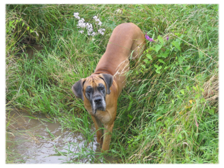 Umso mehr freut es uns, Euch nun berichten zu können, dass Quirinus vor einem halben Jahr endlich sein Zuhause gefunden hat: bei Bettina und Ralf in der Pfalz. Obendrein wartete dort schon Kimy auf ihn, ein dreijähriges Doggenmädchen, mit der Quirinus nun das Sofa teilen darf. In Kimys bis zu zehn Doggen umfassendes Spaziergeh-Rudel hat sich Quirinus problemlos eingefügt. |