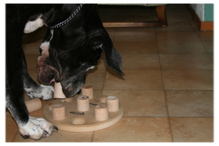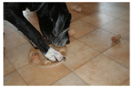 Die Einkerbungen füllt man mit Leckerli und setzt dann die Aufsätze drüber. In jedem Aufsatz befindet sich ein kleines Loch, so dass der Hund die Leckerli riechen kann. Die Aufsätze sitzen so fest, dass der Hund die Aufsätze weder mit der Nasse umstossen noch mit der Pfote herausbekommen kann, sondern nur an die Leckerli gelangt, wenn er die Aufsätze mit den Zähnen heraushebt. Für den Hund besteht die Aufgabe also zunächst darin herauszufinden, wie er an die Leckerli kommt. |