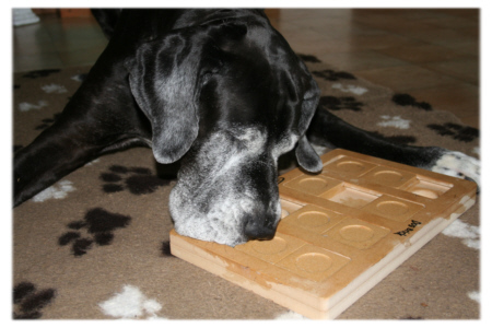 Heute überraschte mich allerdings Quattro, der beim DogSmart noch deutlich länger brauchte als Lava. Er hatte bei DogBrick allerdings eine Technik entwickelt, die wohl von den Erfindern so nicht eingeplant war: Nachdem er mitbekommen hatte, dass die Aufsätze leicht verrutschen, wenn das Spiel gegen ein Hindernis stösst, schob er das Spiel mit Pfote und Schnauze quer durch den Raum, bis es gegen ein Tisch- oder Stuhlbein stiess und die Aufsätze einen Blick auf die Würstchen freigaben, die er sich dann ohne grossartiges Verschieben der Aufsätze schmecken lassen konnte. Ganz schön clever!