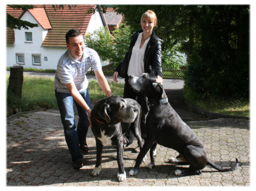 Heute bekamen wir lieben Besuch von Michaela und ihrem Freund Andreas. Michaela ist die junge Künstlerin, die das wunderschöne Portrait von Lava und Quattro gezeichnet hat. Nun wollte sie ihre beiden Modelle, die sie nur von Fotos kannte, gern einmal in natura kennenlernen. Lavas Herz eroberten Michaela und Andreas im Sturm. Nachdem Lava in Andreas` Hand die Tüte mit den mitgebrachten Würstchen und anderen Leckereien entdeckt hatte, wich sie den beiden nicht mehr von der Seite. Quattro hingegen verhielt sich wie allen Fremden gegenüber zunächst sehr reserviert. Nach und nach “taute” er aber “auf” und liess sich ausgiebig streicheln. Auf den nächsten Besuch von Michaela und Andreas müssen wir etwas warten, denn Michaela wird ein Jahr in Kanada studieren. Doch nach ihrer Rückkehr kommen sie uns vielleicht schon zu dritt besuchen, denn dann wird bei Michaela und Andreas ein Hund Einzug halten. Und nun dürft Ihr raten, was für einen Hund sich die beiden wünschen. |