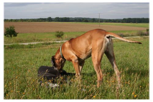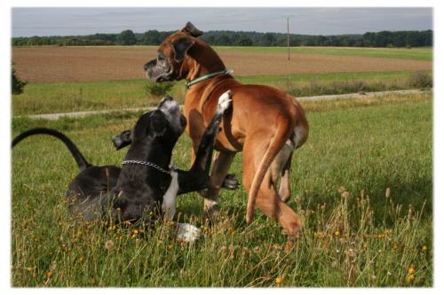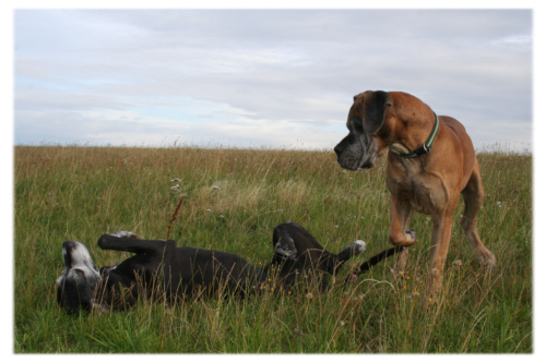 Heute konnte Quattro wieder einmal gemeinsam mit seinem Freund Bruno spazierengehen. Die Zeiten, in denen die beiden stundenlang über die Wiesen flitzten, sind leider vorbei. Mittlerweile gehen sie alles etwas ruhiger an. Aber schliesslich sind die Herren nun auch im gesetzteren Alter. Nichtsdestotrotz messen sie nach wie vor ihre Kräfte, so oft wie möglich und veranstalten ihre bekannten Wettrennen. Aber oft laufen sie auch einfach nur gemütlich nebeneinander her und schnüffeln hier und da. Und legt sich Bruno für ein Päuschen hin, dauert es nicht lang und Quattro gesellt sich dazu. Aber lange hält es Quattro dann nicht aus und lässt sich schnell etwas einfallen, um Bruno zu necken. Und flugs balgen sie wieder herum wie zwei Jungspunde. |