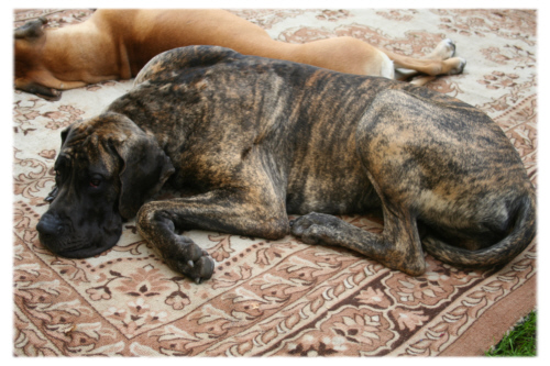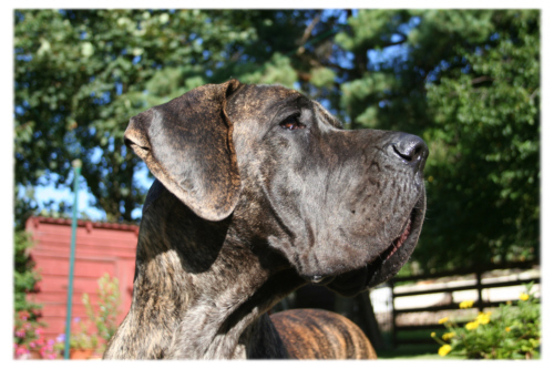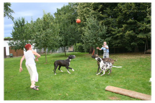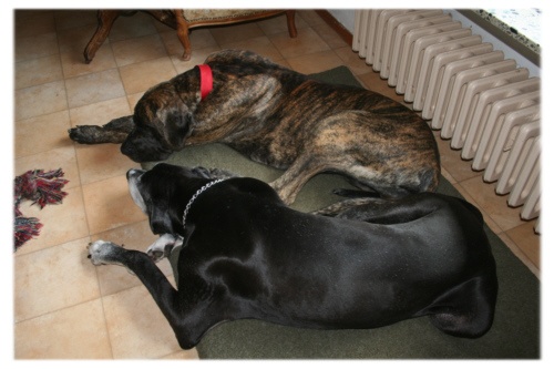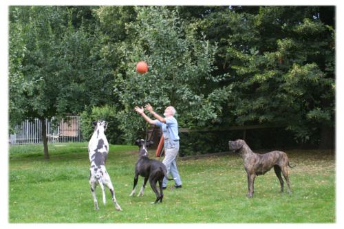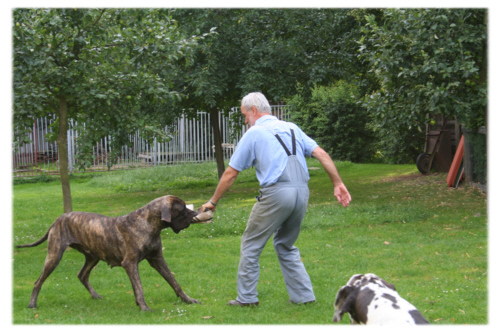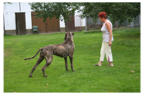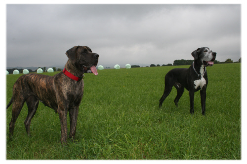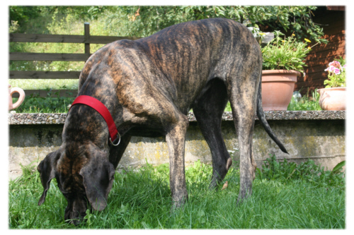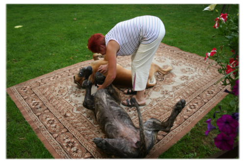 Zwei Tage später waren wir frei nach dem Motto “Wir können sie uns ja mal anschauen” auf dem Weg ins Vogtland. Als wir aus dem Auto ausstiegen, warteten Renate, Peter und ihr Rudel auf uns und eine riesige, gestromte Hündin kam auf mich zugelaufen und leckte meine Hand ab. In diesem Moment war es um mich geschehen, und ich wußte, dass ich sie nicht nur anschauen wollte, sondern sah Ava in Gedanken schon mit Quattro über die Wiesen rennen.