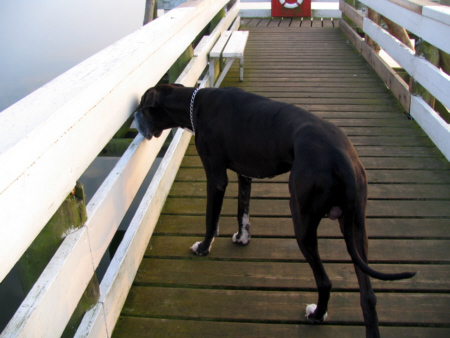 Ich war immer der Meinung, Quattro habe auf Seebrücken etwas Angst und will so schnell wie möglich wieder herunter. Doch nun habe ich gemerkt, dass Quattro unangeleint gern auf den Brücken läuft und neugierig alles inspiziert. In dem Moment war mir klar, weshalb er bei mir an der Leine so unsicher reagiert: ich habe manchmal etwas Höhenangst und ein mulmiges Gefühl, wenn ich ein paar Meter in die Tiefe schauen muss, und genau das merkt Quattro. |