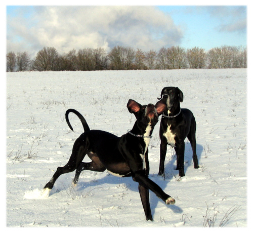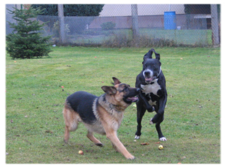 Quattro hingegen genoss es heute wieder in vollen Zügen, mit Bruno toben zu können. “Rette sich, wer kann”, heisst es, wenn diese beiden über die Wiesen fegen. Da geht es in rasantem Tempo bergauf und bergab, über Baumstämme, durch hohes Gebüsch oder einfach querfeldein. Quattros neuestes Hobby ist es, aus vollem Lauf in eine Pfütze zu springen, so dass das Wasser bis zu den Ohren spritzt. In der Regel rennt er dann stolz zu uns und schüttelt sich kaum angekommen so kräftig, dass auch wir gleich aussehen, als hätten wir in einer Pfütze gebadet.