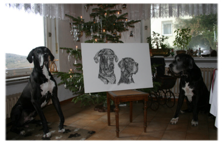 Als ich am Heiligabend das Weihnachtsgeschenk meiner Schwester Christiane auspackte, war ich sprachlos. Was ich sah, war eine wunderschöne Bleistiftzeichnung von Lava und Quattro. Das Portrait stammt von der jungen Künstlerin und Studentin Michaela Frenzel, die über einen Zeitraum von mehr als drei Wochen an dem Bild arbeitete. Eine ganze Packung Bleistifte fand dabei Verwendung. Was dabei herauskam, ist eine Zeichnung, die wohl mein ganzes Leben lang einen Ehrenplatz bekommen wird. Ich hätte nie gedacht, dass man die beiden so originalgetreu abbilden kann. Die Hunde auf der Zeichnung, das sind nicht nur Hunde, die Lava und Quattro irgendwie ähnlich sehen - wenn ich auf das Bild schaue, dann sehe ich genau Lava und Quattro! Jedes Häarchen und jede Falte erkenne ich wieder.