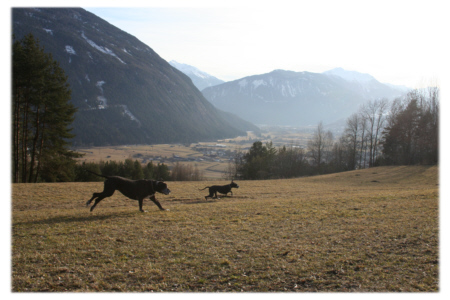 Im Herrengespann mit Quattro hingegen darf Bruno der Chef sein und es klappt nach wie vor sehr gut mit den beiden Rüden. Uns wurde einmal von erfahrenen Hundehaltern prohezeit, dass eine Freundschaft zwischen zwei nicht kastrierten Rüden auf Dauer nicht gutgehen würde. Nun sind die beiden schon lange keine Jungspunde mehr und dennoch vertragen sie sich nach wie vor wunderbar. Es gab noch nie eine ernsthafte Streiterei und daher haben wir auch keine Zweifel daran, dass diese Männerfreundschaft ewig halten wird. Vermutlich passen die beiden aufgrund ihrer unterschiedlichen Wesen so gut zusammen.
