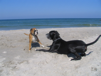 Lilu hatte keine Angst vor der großen Dogge und forderte Quattro immer wieder zum Spielen auf, was dieser sich natürlich nicht zweimal sagen ließ. Lilu gab sich alle Mühe, Quattro dazu zu bewegen, mit ins Wasser zu kommen. Doch, was wir schon so oft versucht hatten, gelang leider auch ihr nicht. Dabei hatte ich immer meine Hoffnung darauf gesetzt, dass Quattro vielleicht seine Angst vor dem Meer verlieren würde, wenn er einen Spielgefährten findet, der ihm zeigt, dass es schön ist zu baden.