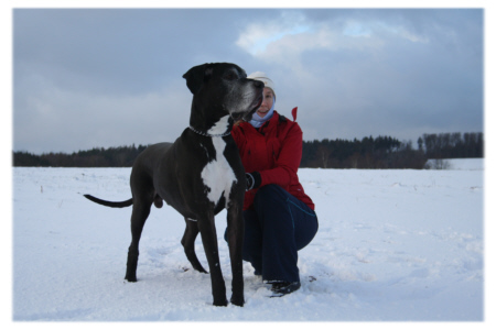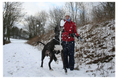 Für Lava stand heute ein Besuch in der Tierklinik Mühlhausen auf dem Programm. Da sie in den letzten Tagen immer wieder kurzzeitig ohne ersichtlichen Grund humpelte, hielt ich einen Tierarztbesuch für erforderlich, um der Ursache auf den Grund zu gehen. Außerdem hatte ich schon länger geplant, Lava einmal gründlich untersuchen zu lassen und dabei insbesondere einen Herzultraschall vornehmen zu lassen. Auch wenn sie noch ganz und gar nicht den Eindruck einer alten Dame macht, so darf man doch nicht außer Acht lassen, dass sie im nächsten Monat bereits das 8.Lebensjahr vollendet und Herzkrankheiten bei älteren Doggen sehr häufig auftreten. Wie ich bereits an anderer Stelle berichtet habe, hat Lava große Angst vor Tierärzten. Dies zeigte sich auch heute, als sie sich im Behandlungszimmer sogleich streikend in eine Ecke legte. Da halfen nicht einmal die gekochten Hähnchenherzen, die Lava in einer anderen Umgebung mit Genuss verschlingt. Für den Herzultraschall war es jedoch erforderlich, Lava auf einen Behandlungstisch zu heben, was sich angesichts einer 75kg schweren und streikenden Dogge als der schwierigste Akt herausstellte. Aber zu viert war auch das möglich, und oben auf dem Tisch angekommen wurde Lava zu zunehmend ruhiger, was nicht zuletzt auch an Tierärztin Frau Ruppe-Puy und ihren Kollegen lag, die sich viel Mühe gegeben haben, damit Lava sich wohlfühlt.