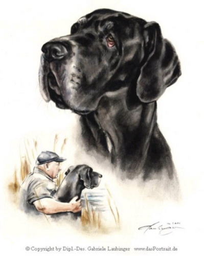 Ich glaube, jeder Hund hat einen Menschen, zu dem er ein ganz besonderes Verhältnis hat, der für ihn einen höheren Stellenwert hat als alle anderen. Für Lava war das vom ersten Moment an mein Vater gewesen. Die beiden hatten schon in den ersten Minuten ihres Kennenlernens ein Band geknüpft, das zeitlebens hielt. Wir alle vermissen Lava sehr, doch meinem Vater fehlt sie ganz besonders. Mir lag es schon lange am Herzen, ihm etwas zu schenken, das ihn an Lava erinnert. Deshalb habe ich von Gabriele Laubinger ein Aquarell von Lava malen lassen. Das Bild ist wunderschön geworden und ich möchte es Euch nicht vorenthalten.