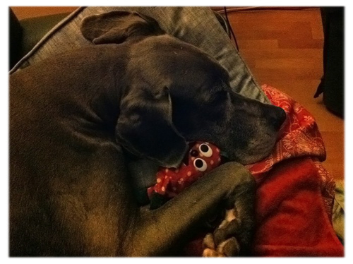 Auch Sybilles blauer Doggendame Iska konnten wir mit dem lustigen Geselllen eine Freude bereiten. |
