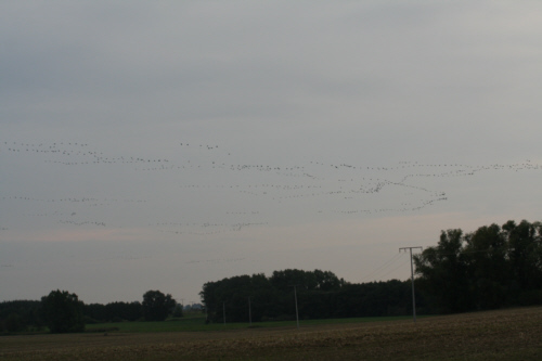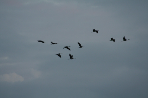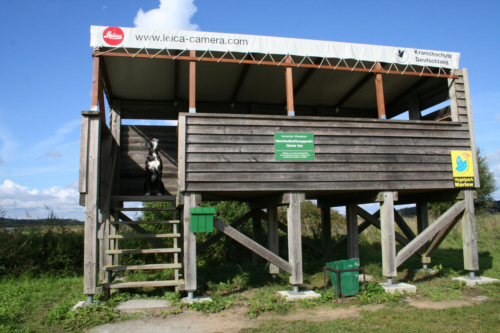 Zunächst war ich etwas skeptisch, eine Unterkunft inmitten der Kranicheinflugschneise zu mieten, da ich nicht wußte, wie Quattro reagiert, wenn täglich tausende Kraniche über uns hinwegziehen. Lava und Quattro veranstalten zuhause bereits ein Riesenspektakel, wenn nur ein kleiner Schwarm Zugvögel sich nach Waldhessen verirrt. Und da auch kleine Schwärme schon viel Krach machen, malte ich mir einen Höllenlärm aus. Doch meine Sorgen waren völlig unbegründet. Quattro liess sich von den vielen Vögeln und ihren trompetenden Rufen nicht aus der Ruhe bringen. Ich hatte meinen “Kleinen” mal wieder unterschätzt. Quattro war die coolste Dogge im ganzen Nationalpark: nachdem ich mich im Kranichinformationszentrum erkundigt hatte, ob es möglich ist, einen Hund mit zum Beobachtungsturm nehmen zu können, war Quattro sowohl beim morgendlichen Abflug der Vögel als auch beim abendlichen Einflug hautnah dabei. Durch seine Anwesenheit auf den “Uitkieks” vergassen manche Vogelfreunde ganz und gar, dass sie wegen der Kraniche gekommen waren.