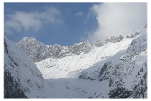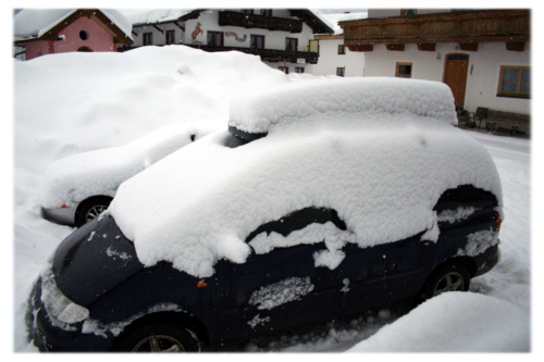 Man nennt Leutasch auch das “Tal, wo der Schnee wohnt”. Wieviel Schnee in diesem Winter dort wohnt, hat auch die Tiroler überrascht. Seit unserer Ankunft schneite es ununterbrochen, und von Tag zu Tag wurden die Schneemassen höher. Was des Skifahrers Freud`, war der Hausbesitzer Leid, denn der Schnee auf den Dächern war nicht ganz ungefährlich. Und so sah man in diesen Tagen viele Einwohner auf dem Dach Schnee schippen. |