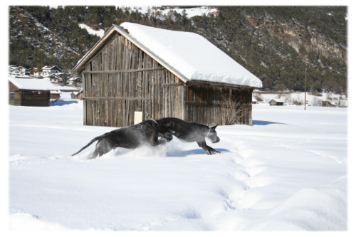 Also verlegten wir die Spaziergänge kurzerhand ins tiefer gelegene Gurgltal, wo weitaus weniger Schnee lag und Lava und Quattro ausgiebig in der weißen Pracht spielen konnten. |