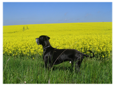 Beim gemeinsamen Spaziergang mit Bruno jagte uns Quattro heute einen großen Schrecken ein, als er sich auf steinigem Boden die Pfote verletzte. Äußerlich war nichts erkennbar und auch fühlen konnten wir nichts, doch Quattro jaulte herzerweichend und konnte die Pfote nicht mehr aufsetzen. Nachdem er eine Weile gelegen hatte, hinkte er nur noch leicht und war schon wieder drauf und dran, Bruno zu einem Spielchen herauszufordern, als wäre nichts gewesen. Doch das konnte ich ihm mit einer verletzten Pfote nicht mehr erlauben, und so fuhr ich mit ihm wieder nach Hause.
