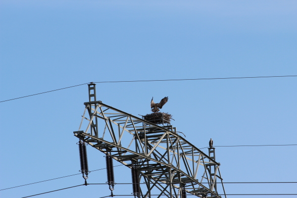 Am nächsten Tag hatten wir auch noch das Glück, beide neben unserem Hotel ansässigen Fischadler beobachten zu können. Es hat uns im Hinblick auf den vergangenen Tag verwundert, dass sich diese beiden Adler überhaupt nicht durch Fußgänger, Radfahrer oder gelegentlich Autos stören liessen, obwohl ihr Horst viel näher an den Menschen lag als der des durch die Kamera permanent “in der Öffentlichkeit stehenden” Paares.