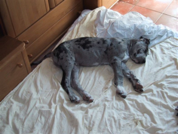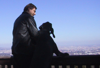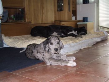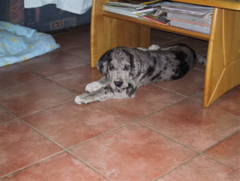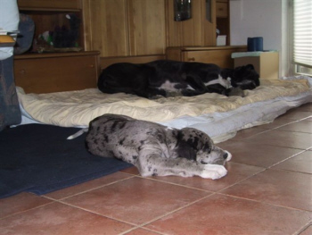 Dann endlich kam ein Wiener Auto daher, und ich wusste gleich: das muss meine Yana sein! Und siehe da, heraus kam eine hübsche schwarze Doggendame, die die Ähnlichkeit mit mir wirklich nicht abstreiten konnte. Stürmisch wie ich bin, bin ich gleich auf Yana zugerannt, um sie zu begrüßen und kassierte gleich mal ein Brummen von Yana. Wie große Schwestern eben so sind, dachte ich mir, sie wollen immer, dass sich die Kleinen ordentlich benehmen. Also war ich einfach nicht ganz so stürmisch-ich wollte ja einen guten Eindruck auf Yana machen. Margit und Thomas habe ich gleich ins Herz geschlossen, sie hatten mir sogar extra einen großen Leckerbissen mitgebracht, den ich abends im Lokal gleich mit Vergnügen verspeist habe. Peter, der Onkel, der mich immer “Audi” ruft, war auch dabei.