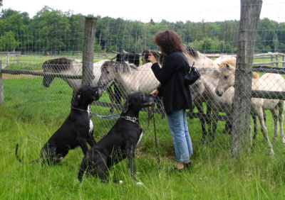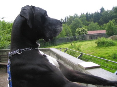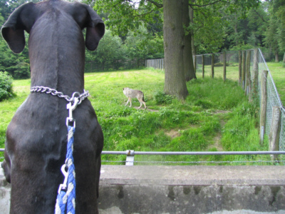 Nachdem wir die Wölfe verlassen hatten, öffnete der Himmel all seine Tore, und es regnete in Strömen. Da die nächste Schutzhütte etwa 5 Minuten Fussweg entfernt war, suchten wir Schutz unter einigen Bäumen, die uns jedoch nach einigen Minuten auch keinen Schutz vor den Wassermassen mehr bieten konnten. So liefen wir dann zur nächsten Schutzhütte und trockneten die Hunde und uns erst einmal provisorisch. Wir mussten lange warten, bis der Regen endlich nachliess. Aber langweilig wurde es nicht, da die anderen Menschen, die die Hütte ebenfalls als Unterschlupf vor dem Regen nutzten, viel über die beiden Hunde wissen wollte, und eine Gruppe Kinder Elly und Quattro streicheln wollte. Elly ließ sich geduldig von einer ganzen Schar Kinderhände streicheln. Quattro hingegen sah wohl den Regen als das geringere Übel an und hatte nichts eiligeres zu tun, als sich einen Platz vor der Hütte zu suchen.