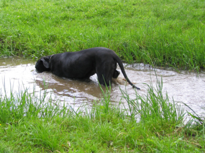 Als der Regen endlich aufhörte, konnten wir unseren Rundgang fortsetzen. Nach einer Weile kam sogar die Sonne zum Vorschein. Als wir an einen Bach kamen, nutzte Elly die Gelegenheit nicht nur zum Trinken, sondern nahm erst einmal ein ausgiebiges Bad.