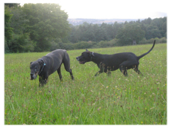 Das Wetter ist jetzt richtig angenehm für Spaziergänge. Der Himmel ist zwar bewölkt, aber es ist noch warm, und ein kräftiger Wind sorgt für die nötige Abkühlung. Für die Hunde ist es das ideale Wetter, um gemeinsam zu toben und durch die Natur zu streifen. Lava geboss es sichtlich, heute einmal ohne einen ihrer vierbeinigen Verehrer spazierengehen zu können. Sie nutzte die Gelegenheit, spielte ausgelassen mit einem Stöckchen und erfrischte sich im Bach. Quattro und Bruno hingegen erkundeten heute wieder einmal gemeinsam die Gegend.