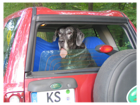 Was erregt auf einer Kirmes mehr Aufmerksamkeit als jedes Karrussel? Richtig: eine Deutsche Dogge. Das Gefühl jedenfalls hatte ich heute, als ich Quattro zu einem kleinen Abstecher auf die Kirmes im thüringischen Seligenthal mitgenommen habe und viele Fragen beantworten musste. Die Ansicht, eine Dogge müsse doch angesichts ihrer Größe täglich ein halbes Kalb verschlingen, scheint weit verbreitet zu sein. Umso erstaunter sind die Leute dann meist, wenn es gar nicht so viel ist, was eine Dogge am Tag zu sich nimmt. Für Quattro waren die vielen Menschen etwas ungewohntes, und man merkte ihm an, wie aufgeregt er war. Die Karrussels passierten wir zügig, denn bei dem Lärm hat meiner Meinung nach ein Hund nichts verloren. Die Ponys und Pferde, an denen wir vorbeiliefen, ließen Quattro unbeeindruckt und auch gegenüber den anderen Hunden benahm er sich tadellos, so dass er sich nach diesem Ausflug eine große Belohnung verdient hatte.