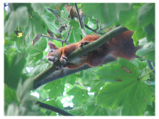 Heute hatten wir Besuch von einem Eichhörnchen, das unbekümmert durch den Garten sprang. Als Quattro den seltenen Gast entdeckte und zu ihm laufen wollte, flüchtete das Eichhörnchen auf einen Baum. Frech schaute es von oben herab, während Quattro vor dem Baum aufgeregt hin und her lief, sichtlich enttäuscht, dass alle Versuche, ebenfalls auf den Baum zu gelangen, fehlschlugen.