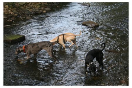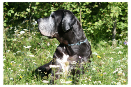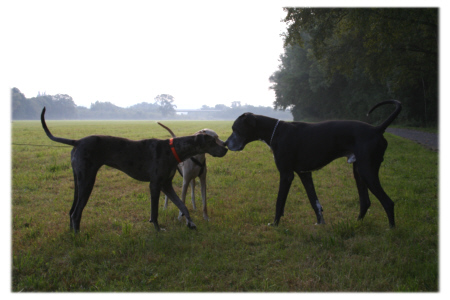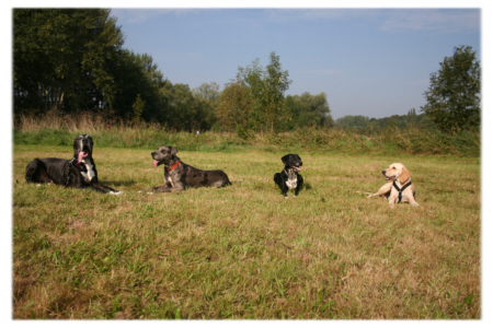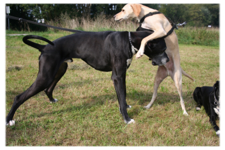 Als sich auf einer Wiese zwei fremde Rüden zu unserem Quartett gesellten, kam es zu einer Rauferei zwischen Quattro und einem Labrador. Quattro, der sich als Chef des kleinen Rudels fühlte, versuchte den Konkurrenten zu unterwerfen. Dieser dachte jedoch nicht daran, sich Quattro einfach so unterzuordnen, und so kämpften die beiden darum, wer der Stärkere ist. Es zeichnete sich ab, dass der Schaukampf der beiden nicht in der ersten Runde entschieden werden konnte, und so war ich froh, als sich Quattro abrufen liess und wir so die beiden Rivalen recht schnell trennen konnten. Leider wurde meine Freude dadurch getrübt, dass die Konfrontation in Quattros Fell einige Löcher hinterlassen hatte. Auf weitere neue Rüdenbekanntschaften legte ich an diesem Tag daher keinen Wert mehr. Immerhin hatte Quattro in Murphy einen neuen Freund gefunden, mit dem er nach Herzenslust herumtoben konnte.