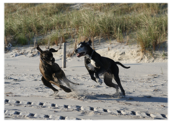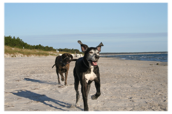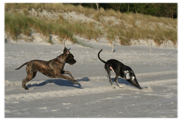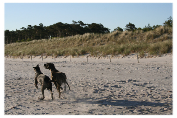Damit Quattro und Ava bei angenehmen Temperaturen ausgiebig am Strand toben konnten, waren wir morgens um sechs Uhr die ersten Besucher am Hundestrand. Um diese Zeit war der Strand fast immer noch menschenleer, nur einige Hundefreunde und Jogger liessen sich mitunter blicken. |