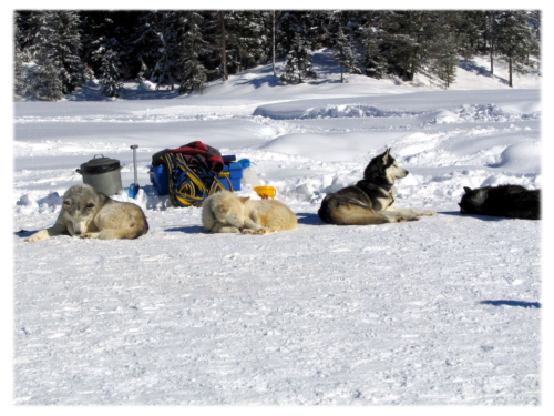 Das Wetter hätte nicht besser sein können an diesem Tag: blauer Himmel, Sonnenschein und glitzernder Schnee, soweit das Auge reicht. Der Workshop fand auf dem Lottensee statt, einem See, der sich gemäß der alten Bauernregel “Im Winter viel Schnee, im Sommer viel See!” nur aperiodisch zeigt, indem er sich nach dem Winter mit Schnee-Schmelzwasser füllt. Am Lottensee erwarteten uns drei Musher (so nennt man die Führer der Hundeschlittengespanne) mit ihren aus Sibirian Huskies und Alaska Malamutes bestehenden Rudeln.
